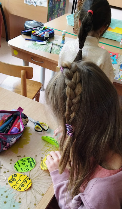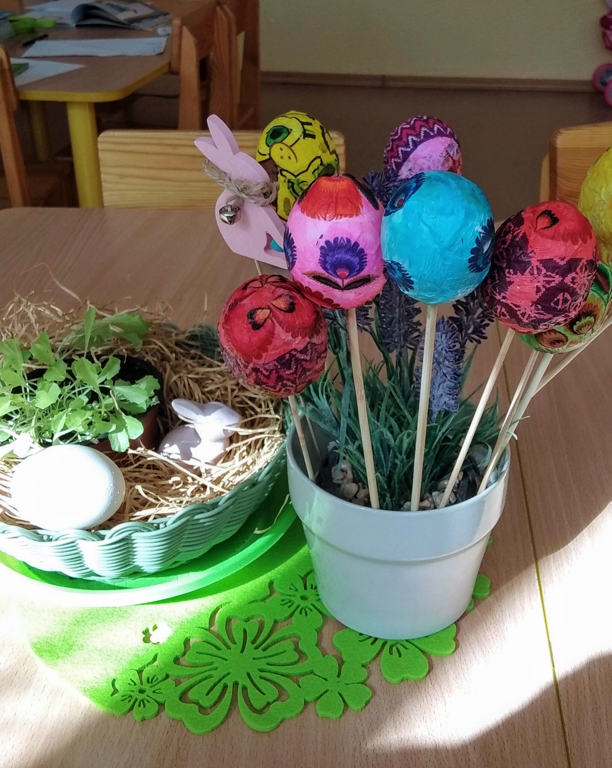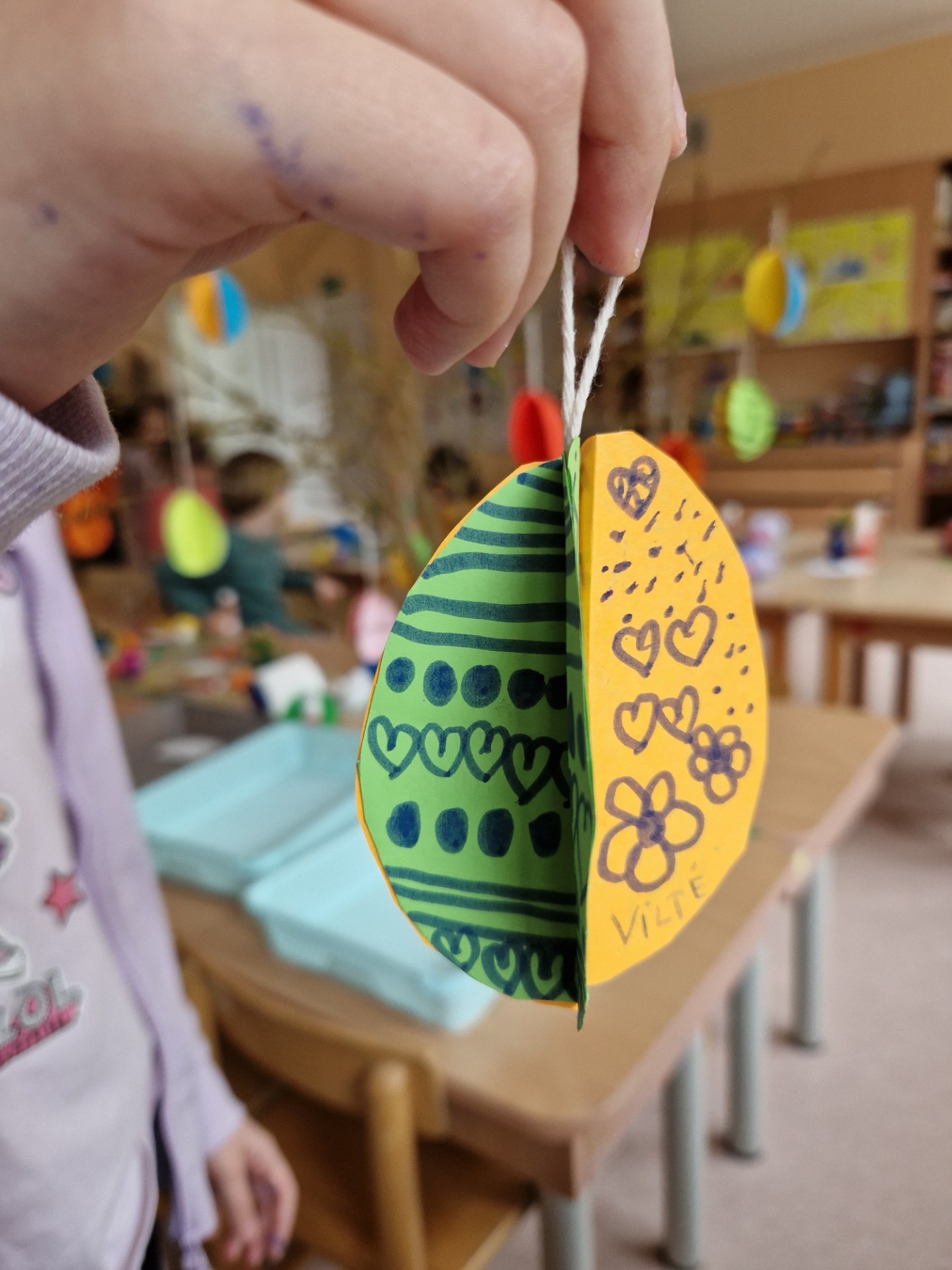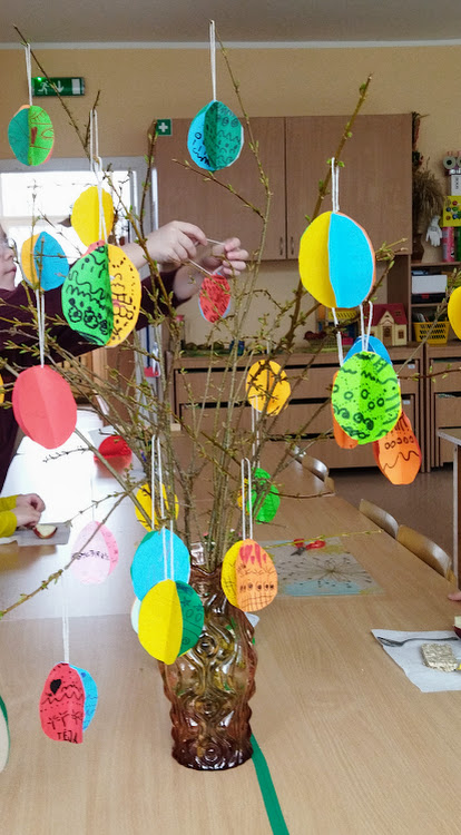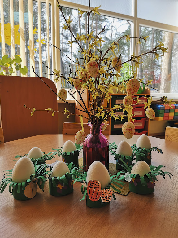 Šiemet sugalvojame papuošti nukirptą forzitijos krūmo šakelę (mokytoja kasmet ją apgeni, nes šis krūmas linkęs plėstis) iš popieriaus pagamintais margučiais.